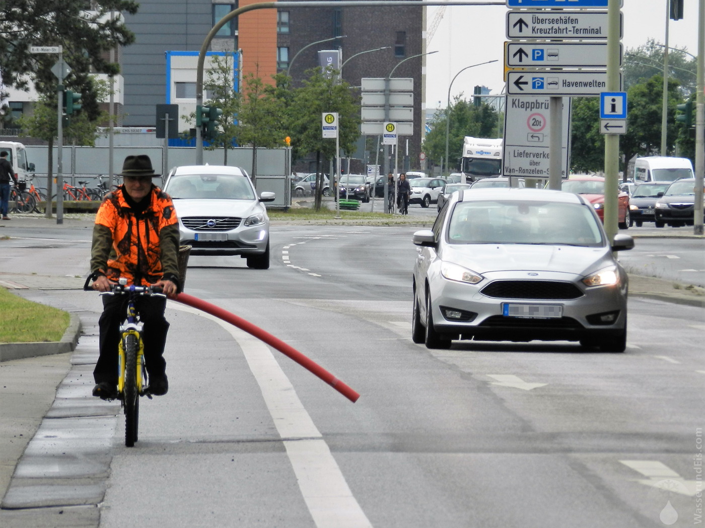 Wir, Christian Neuhäuser (GRÜNE Bremerhaven) und Ralf Ekrowski (SPD Bremerhaven Mitte) wollen auf die Situation der Radfahrer in Bremerhaven aufmerksam machen, und begeben uns auf eine Pool-Nudel Tour! Eine Pool-Nudel auf dem Gepäckträger repräsentiert den Sicherheitsabstand von 1,50 m, den Fahrzeuge beim Passieren von Radfahrern einhalten müssen. Unsere erste Station: Die Columbusstraße.