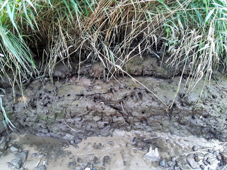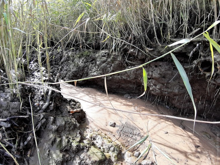 Wie eifrigen Lesern bereits bekannt ist, sind wir in der warmen Jahreszeit, bei gutem Wetter und sommerlichen Temperaturen regelmäßig am Weserstrand von Oberhammelwarden zu finden. Während der Strandbereich bereits im Jahr 2018 deutliche Zeichen von Verschlickung zeigte, hatte sich die Situation im Vorjahr wieder verbessert. Nun wieder eine Rolle rückwärts, der Strand ist schlickiger als jemals zuvor. Tiefer, brauner Schlick – überall. Eine große Abwertung für diesen Strandabschnitt. Auch das Ufer zeigt starke Veränderungen. Das Ufer ist hier unbefestigt. Der Sand schwindet – insgesamt hat der Strand aber dank Schlick an Höhe gewonnen. Dort wo er in den Marschboden übergeht hat sich ein Steilufer gebildet. Durch den Wellenschlag vorbeifahrereder Schiffe wandert diese Kante immer weiter und unaufhaltsam landeinwärts, liefert neuen schlickigen Nachschub.
