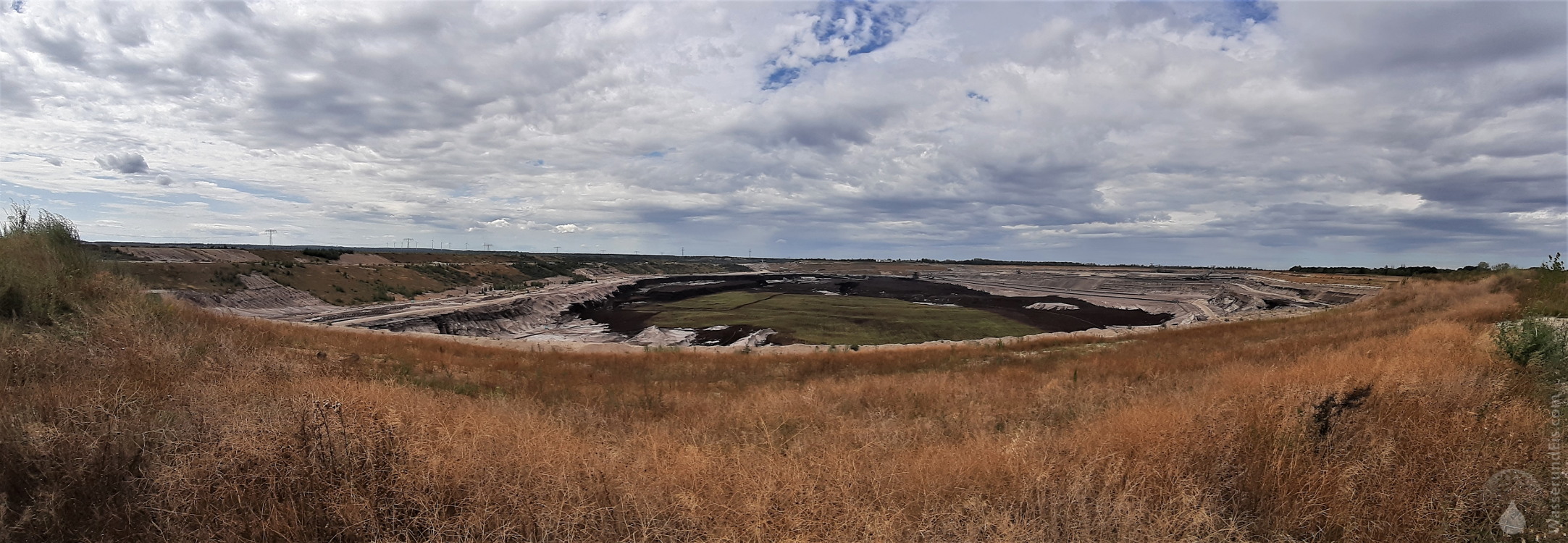 Panoramabild des Abbaufeldes Peres im Braunkohletagebau Vereignigtes Schleenhain. Dier derzeit aktive Grube misst 2,8km² und ist bis zu 10m tief.