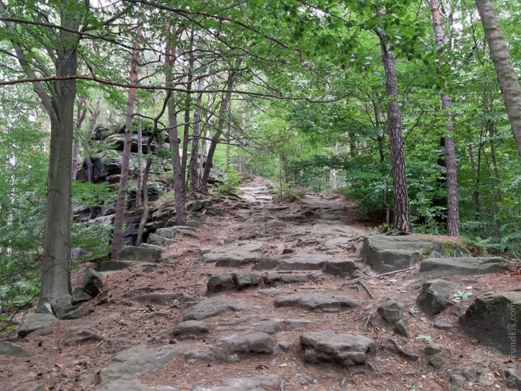 Ausgangspunkt ist unsere Unterkunft in der Stadt Wehlen. Wir setzen über die Elbe über, die gleichzeitig den tiefsten Punkt der Rundwanderung markiert (~110m). Eigentlich beginnt der Aufstieg zum Rauenstein bereits an der Elbe. Von hier an geht es nur noch bergauf. Wir queren den linkselbischen Ortsteil Pötzscha und erreichen nach gut 800m den Siedlungsrand, wo wir bereits 50 Höhenmeter gewonnen haben. Anschließend biegt der Rauensteinweg, der hier ebenfalls einen Abschnitt des Fernwanderweges, Malerweg, bildet in den Wald ab. Ab hier geht es für einige hundert Meter über blanken Fels und losen Schotter steil nach oben. Auf nur 300m Strecke überwinden wir 70 Höhenmeter. Anschließend flacht der Weg etwas ab, nach weiteren 800m erreichen wir den Waldrand und die Sandsteinfelsen des Rauensteins. Den eigentichen Startpunkt des Gratweges.