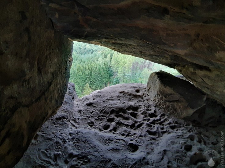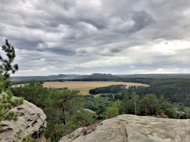 Fast überall reich der Blick weit über das Elbtal bis hin zu den Felsen der Bastei. In der anderen Richtung zeigen sich die markanten Tafelberge des Königs- und des Liliensteins. Der Kulminationspunkt des Gratwegs, der Rauenstein (305m) überragt die übrigen Felsen zwar nur marginal, bildet aber gleichzeitig den Wendepunkt der Tour – von hier aus geht es überwiegend bergab. Die lange, steile und stählerne Treppe in einer schmalen Felsspalte ist das größte Hindernis für unseren Hund, der bis dato tapfer durchgehalten hat. Hier muss er dann aber doch auf den Arm.
