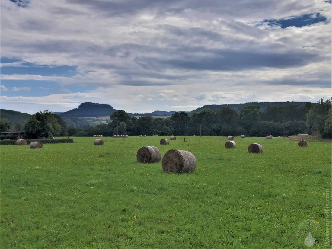 Wiese am Südfüß des Lilienstein, rechts der flache Quirl, links der Pfaffenstein. Dazwischen liegt noch der Taleinschnitt der Elbe. vergrößern