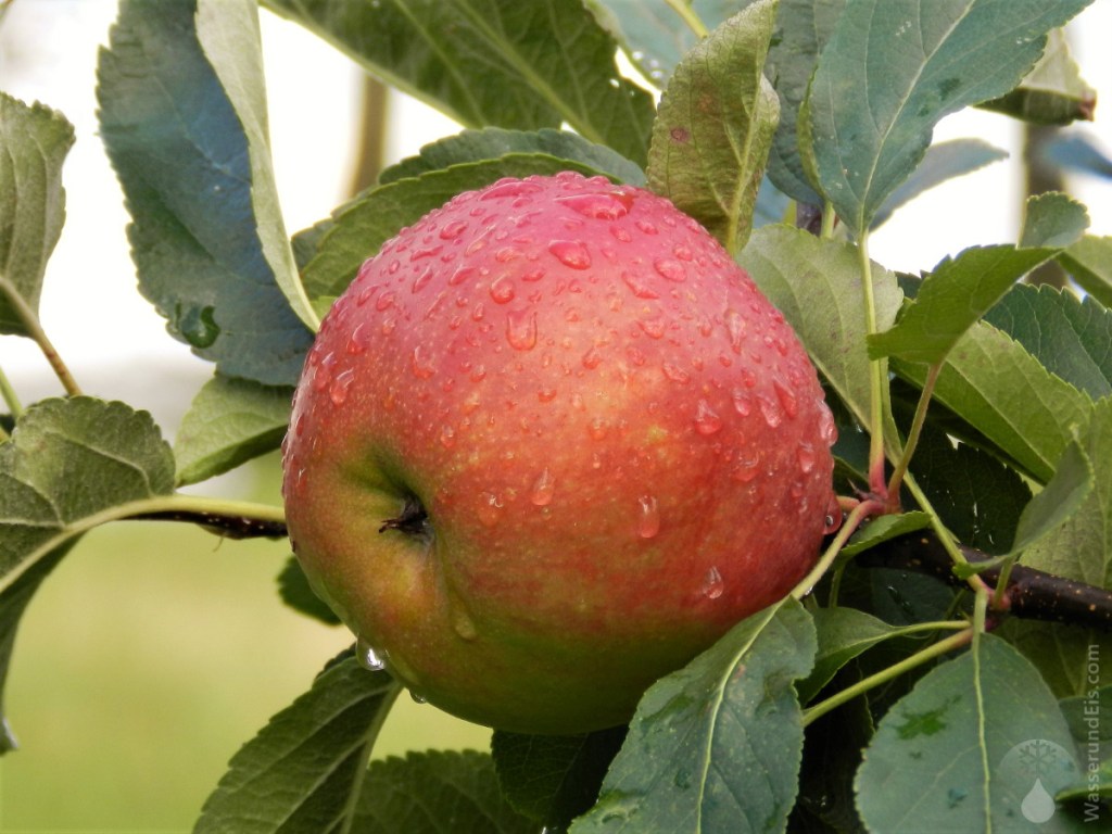 Fast reifer Apfel mit Spuren des letzten Regenschauers. Na Apetit?