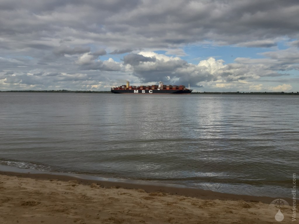 Draußen auf der Elbe ziegt ein großes Containerschiff vorbei. Noch ist das Wasser ruhig.
