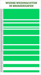 Dies war im klimatischen Mittel, 1961-1990 9 mal der Fall. Die Chance für weiße Weihnachten lag entsprechend bei überraschend hohen 30%. In den vergangenen 30 Jahren, 1990-2019 war dies nur noch 5 mal der Fall. Entsprechend ist die Wahrscheinlichkeit für weiße Weihnachten auf 17% zurückgegangen. Das letzte weiße Weihnachtsfest datiert auf das Jahr 2010.