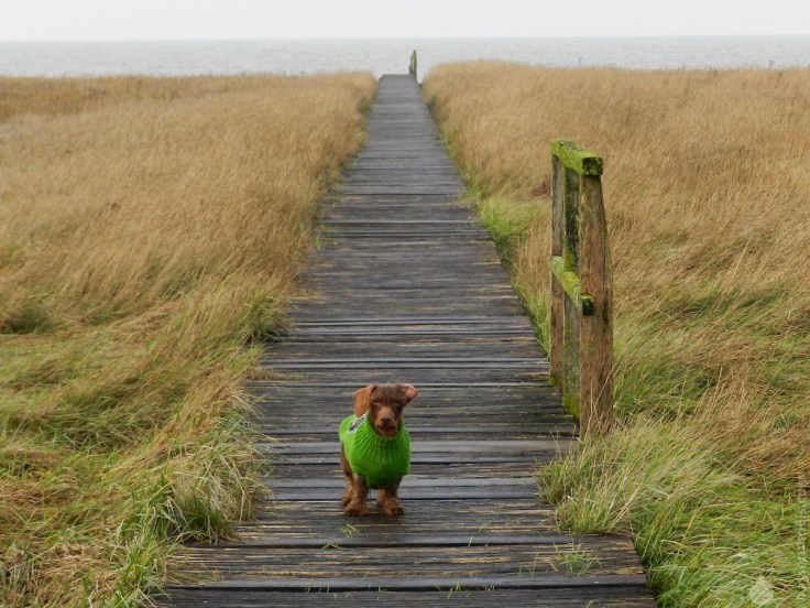 Ziel unseres trüben Winter Ausflugs ist Cappel-Neufeld. Der kleinste, einsamste und naturbelassenste der vier Badeortte an der Wurster Nordseeküste. Ausführlicher beschrieben habe ich dieses Kleinod bereits vor gut zwei Jahren und bei wesentlich mehr Sonnenlicht. Genau wie damals suchen wir auch heute die frische Luft und hoffen auf den ein oder anderen Sonnenstrahl. Die bekamen wir auch, mehr war nicht drin. Wie erwartet waren wir praktisch alleine in den Salzwiesen. So bedrückend das trübe Wetter auch ist, es lässt das weite platte Land wesentlich endloser erscheinen als es tatsächlich ist. Weit hinten, am Horizont, küssen sich dazu, grau in grau, Meer und Himmel.