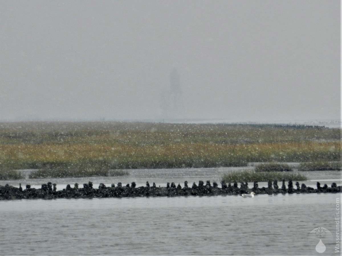 Ein Schneeschauer trübt die Sicht noch weiter – lediglich die Silhouette des Leuchhturmes Obereversand scheint noch durch. Trübes Wetter kann auch Spaß machen.