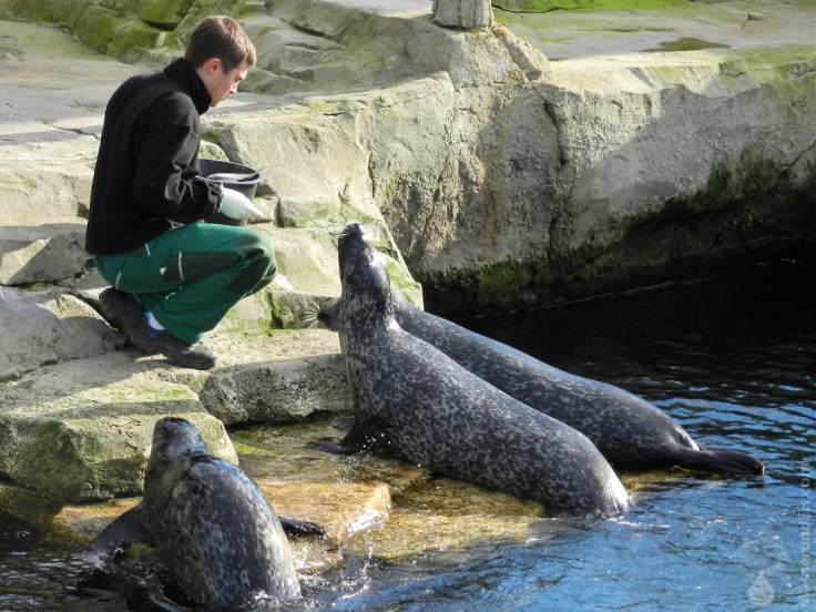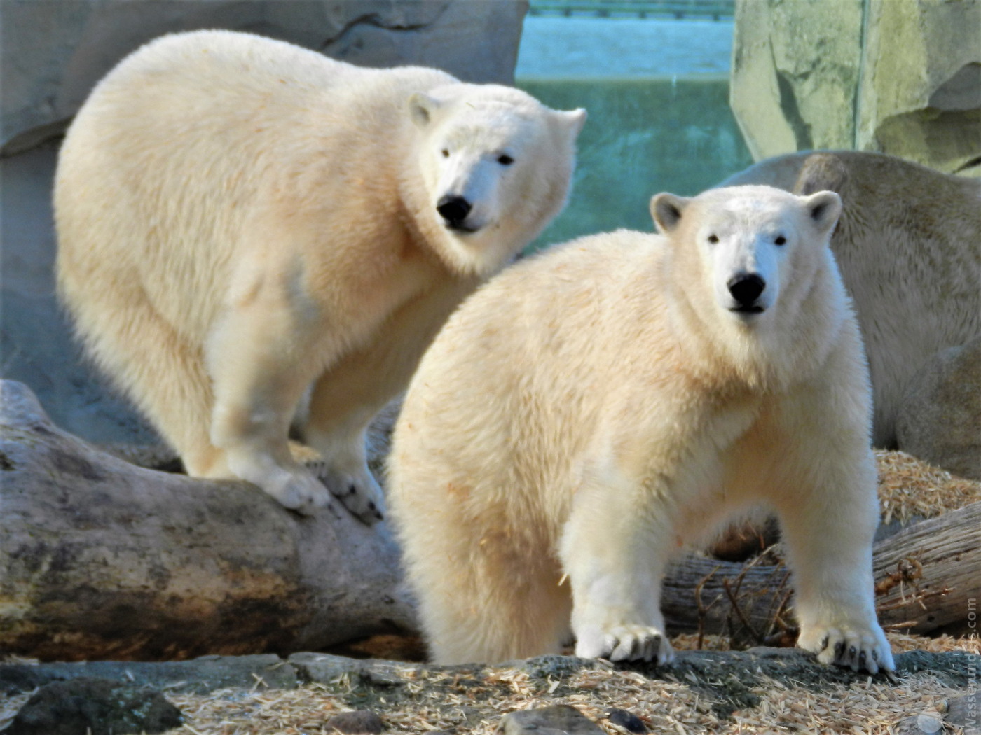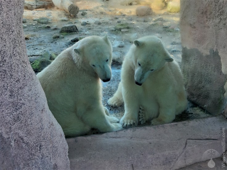Die beiden jungen Eisbärinen, Anna und Elsa sind inzwischen halbwüchsig, kaum mehr kleiner als ihre Mutter – aber weitaus neugieriger und verspielter. Ich schätze sie genießen die Aufmerksamkeit und die Abwechslung die ihnen die ZoobesucherInnen bescheren. Ohne Menschen kommt in den Gehegen oft Langeweile auf – gerade die Robben sind davon betroffen und zeigen uns Gästen ihre Freude.