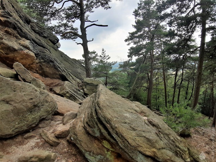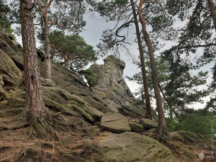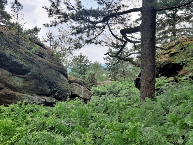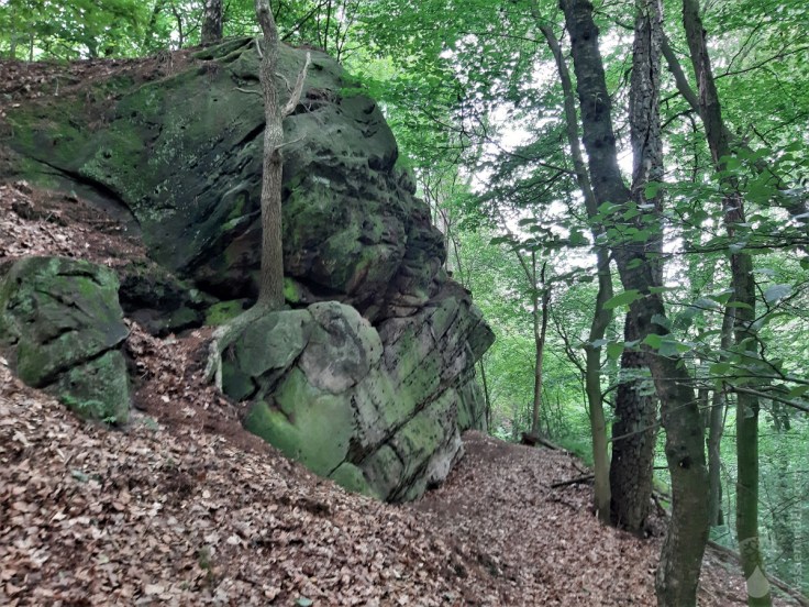 Etwas abseits des Wegesrandes liegen die Felsformationen rund um die Eulenschlucht. Hier wachsen die Farne Mannshoch und wir kommen uns vor wie in einer längst vergangenen Zeit. Da die Eulenschlucht nicht umsonst so heißt, haben wir uns einen näheren Blick gespart. Hier brütet der Uhu worauf mehrere Schilder hinweisen. Bitte nicht stören!