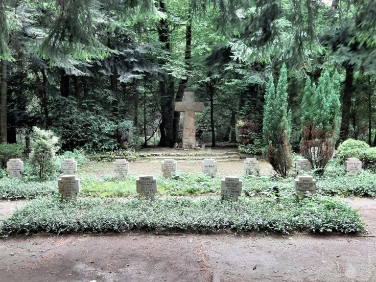 Hinter dem Dreikaiserstuhl erreichen wir bald mit dem Ehrenfriedhof den höchsten Punkt der Tour (165m). An den Dörenther Klippen lieferten sich Verbände der Wehrmacht und der britischen Armee noch in den letzten Kriegstagen erbitterte Gefechte. Im ideologischen Wahn wurden das letzte deutsche Aufgebot regelrecht verheizt. Der Ausgang ist bekannt.
