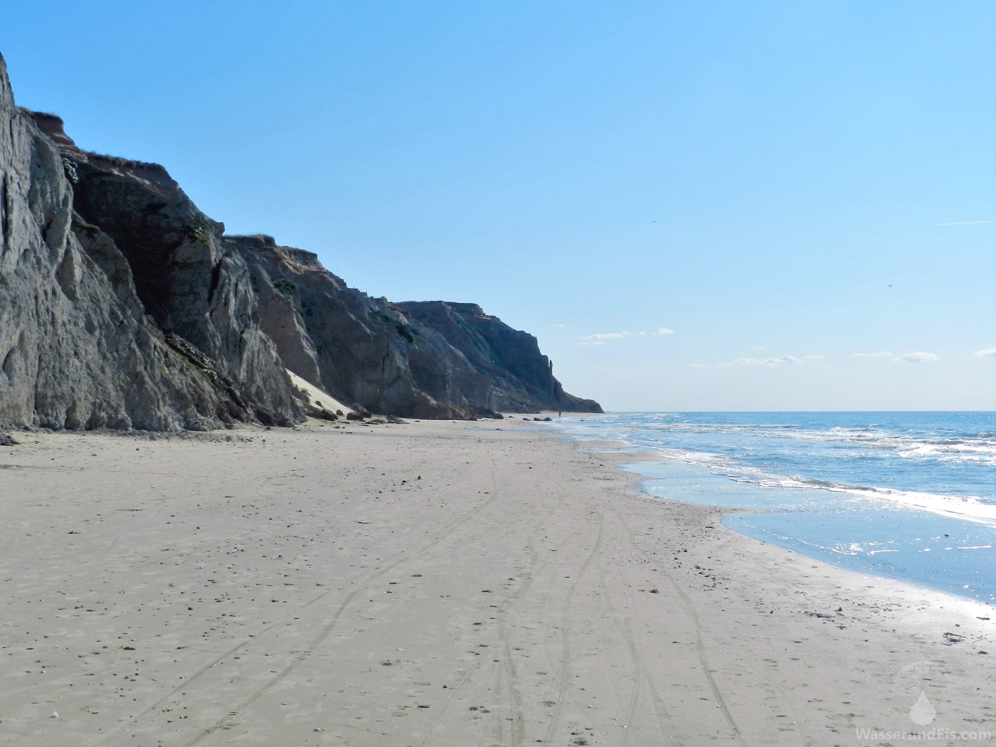Der Strand selbst ist einsam, vom teils regen Treiben oben auf der Düne, rund um den Leuchtturm bekommt man hier unten gar nichts mit – im Gegenteil, die Menschen sind nicht einmal zu sehen. Während die Sonne von einem tiefblauen, fast wolkenlosen Himmel lacht und die Steilküste uns vom Wind abschirmt, fühlen wir uns wie im Hochsommer. Die für uns Wattenmeerbewohner unwirklich blaue und klare Nordsee lädt uns zum baden ein – auch wenn die Wassertemperatur kaum mehr als 15°C beträgt.
