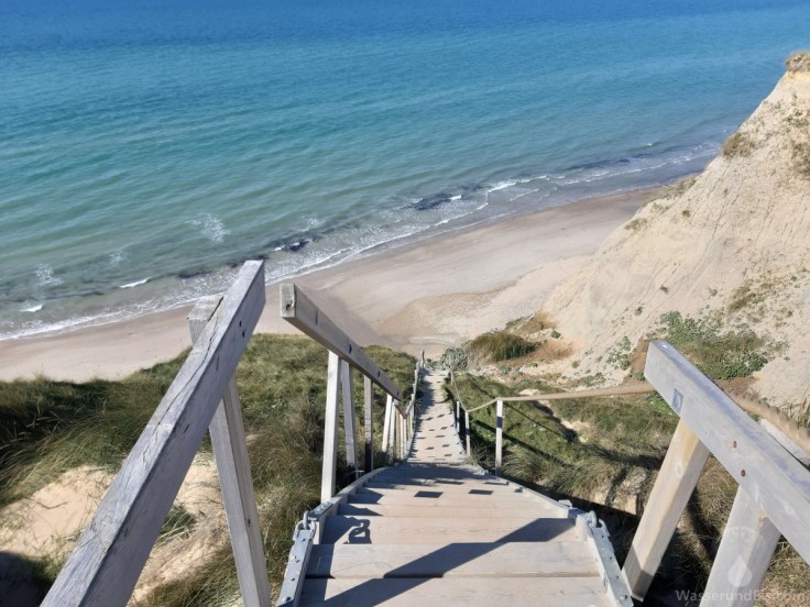Nachdem wir bereits den Leuchtturm erkundet-, die Steilküste hinab geblickt- und das Dünenfeld gequert haben, stehen wir nun an der Treppe zum Strand. Da das Kliff, das Lønstrup Klint bzw die Steilküste von Lønstrup bis zu 70m hoch ist, fast senkrecht zum Meer hin abfällt und ständigen Veränderungen unterworfen ist, gibt es in diesem Bereich keinen natürlichen Weg zum Strand. Eine der wenigen Abstiegsmöglichkeiten ist daher die Treppe am Rand der Sommerhaussiedlung Norre Rubjerg. Die schmale und manchmal wenig vertrauenswürdige Abstiegsmöglichkeit windet sich hier 60m steil den Strand entgegen. Gar nicht so einfach wenn man dazu noch eine zu Stein erstarrten Dackel getragen werden muss.