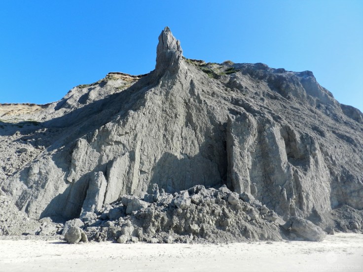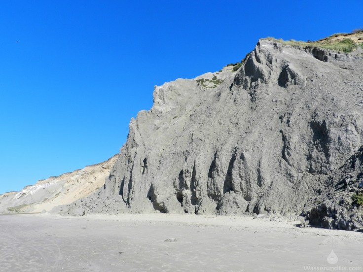Unten angekommen genießen wir erst mal die Windstille, das rauschen der Wellen und den Blick auf die Klippen – die von vom Fuß aus gesehen beinahe noch imposanter als von oben wirken. In der Abbruchkante lassen sich so auch leicht unterschiedliche Sedimentschichten ausmachen. Sand, Ton, Klei und andere Ablagerungen, die vor langer Zeit hier gebildet wurden – oft unter dem Einfluss von Eis. Hier und da sickert Grundwasser vom Fuß der Steilküste in Richtung des Meeres – eine etwas schmierige Angelegenheit, dort wo der Grund tonig ist.