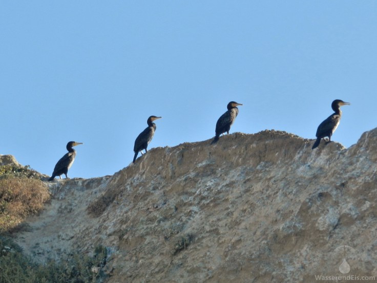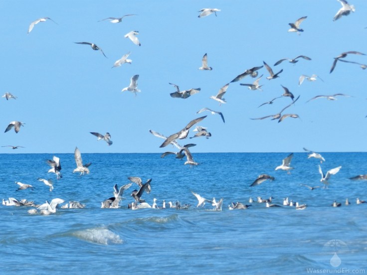 Kurz bevor wir die den Aufgang von Lønstrup erreichen, wir oberhalb der Steilküste zum Parkplatz zurückkehren, erreichen wir noch eine Vogelkolonie. Verschiedene Möwenarten und Kormorane nisten hier, in unzugänglichen Bereichen der Steilküste. Nahe den Ufer scheint ein Fischschwarm unterwegs zu sein, denn urplötzlich taucht eine Große Gruppe Möwen auf die offensichtlich auf der Jagd sind. In Bremerhaven haben sich die „Stadtmöwen“ ja eher auf Fischbrötchen spezialisiert. Auf jeden Fall sind die artistischen Sturzflüge der Vögel toll anzusehen.