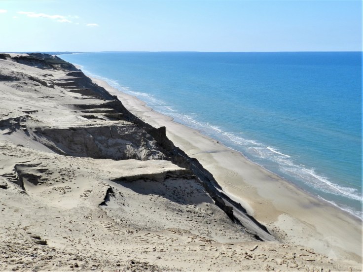 Kaum 70m vom Leuchtturm entfernt klafft der Abgrund. Die Steilküste an der Rubjergs Knude ist an der dänischen Nordseeküste, in ihrer Höhe, unübertroffen. An der ganzen südlichen Nordseeküste – abgesehen von Helgoland, findet sich keine so hohe Steilküste. Einmalig ist auch der Blick auf den Strand und die hier nicht von Sediment getrübten, also tiefblauen Nordsee. Würden wir es nicht besser wissen – wir würden uns an einem ganz anderen Ort wähnen. Sicher sehr viel südlicher, nicht an dem so oft so grün-braunen Meer, an dem auch unsere Wahlheimat liegt.