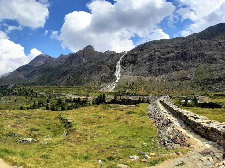 Nach kurzem Aufstieg von der Zufallhütte erreichen wir den flachen Boden des Langentals, dem obersten Abschnitt des Martell. Hier überqueren wir die „Alte Staumauer“ (2.310m). Diese zeugt heute noch heute von der „kleinen Eiszeit“ im 19. Jahrhundert. Damals, erreichten die Alpengletscher ihren nacheiszeitlichen Höchststand, das obere Martelltal war weitgehend von den Eismassen der Gletscher aufgefüllt. Zwischen dem Zungenende des Zufallferners und dem Gletscherende des Langenferners bildete sich nach jedem Winter ein Eisstausee. Im Zuge der Schneeschmelze brachen die Barrieren unter dem Eis und regelmäßige Sturzfluten – mit teils katastrophalen Auswirkungen im Martelltal waren die Folge. Die Staumauer wurde im Jahr 1893 fertiggestellt und konnte sich aufgrund der beginnenden Gletscherschmelze nur ein mal, im Jahr 1895, ihre Wirksamkeit unter Beweis stellen. Inzwischen sind die Eisriesen dramatisch geschrumpft und ungefährlich – im Gegenteil, ihr Verschwinden ist jetzt die brutale Realität und stellt den Wasserhaushalt im Martelltal auf den Kopf. Das können wir sehen und hören. Direkt vor uns stürzt das Schmelzwasser der „kleinen“ Gletscher Schranferner, Ultenmarktferner und Hohenferner im Zufall (so der Name des Wasserfalls) über eine Steilstufe. Gigantische Wassermassen, ohrenbetäubender Lärm. Unvorstellbar, dass jeder Tropfen davon noch vor Stunden gefroren war – und das für eine sehr sehr lange Zeit. Ist das Eis erst einmal Weg, wird es hier im Sommer nur noch ein Rinnsal geben – traurig, aber wahr.