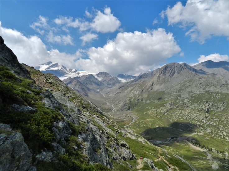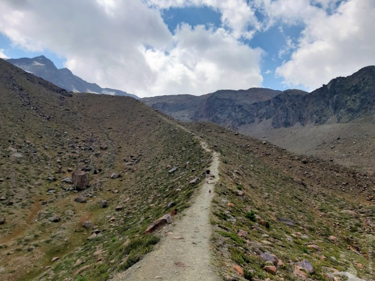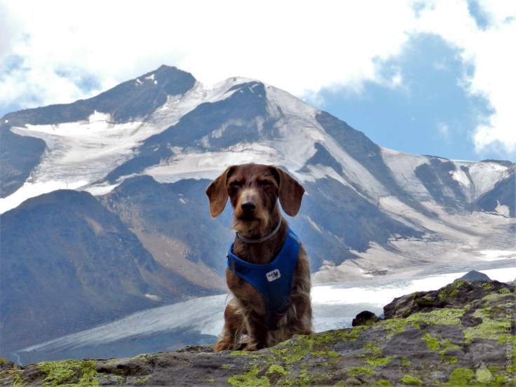 Hinter der Staumauer queren wir noch kurz das wunderschöne Hochtal mit seinen Bachläufen und bewundern den Zufall (2.330m)bevor es ans eingemachte geht. Der anspruchvollste Teil der heutigen Wanderung steht bevor. Zwischen uns und dem Gletschervorfeld, dass uns zur Marteller Hütte führen wird, liegt eine rund 250m hohe Steilstufe. Diese gilt es auf den folgenden Kilometer über Felsen, Geröll und auf aufgesetzten Wegen in Serpentinen zu überwinden. Was sich schweißsteibend anhört ist trotzdem ein Genuß, mit jedem Höhenmeter steigert sich die Aussicht, bis wir schließlich den Talschluss weit unter uns gelassen haben und die Geröllfelder im Gletschervorfeld des Hohenferners (2.530m) erreichen. Hier haben wir uns, auch den letzten Grashalmen, eine kleine Rast verdient. Das gilt auch für unseren Dackel, inzwischen im Seniorenalter, der sich bis hierher Tapfer geschlagen hat.