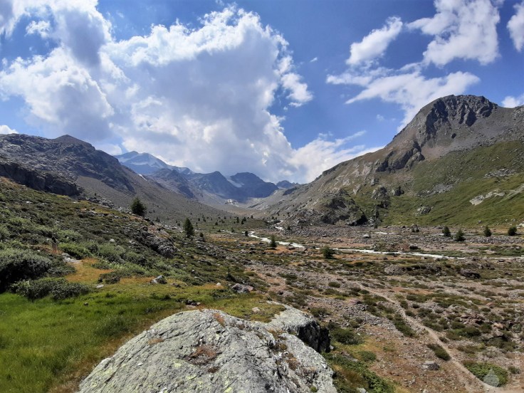 Mit der Marteller Hütte haben wir unser Ziel erreicht, nach der Einkehr machen wir uns auf den Rückweg ins Tal. Zunächst wieder 250 Höhenmeter steil bergab, dann Flach über den Boden des malerischen Langentals. Dieses erreichen wir ungefähr dort, wo sich vor 150 Jahren der Gletscherrand des Zufallferners lag. Noch heute zeugen kleine Moränenwälle und die im Vergleich zur Umgebung, geringere Vegetationsbedeckung, von der einstigen Eisausdehnung. Mittlerweile wachsen hier bereits einzelne Bäume – in 30 Jahren vielleicht ein Wald?