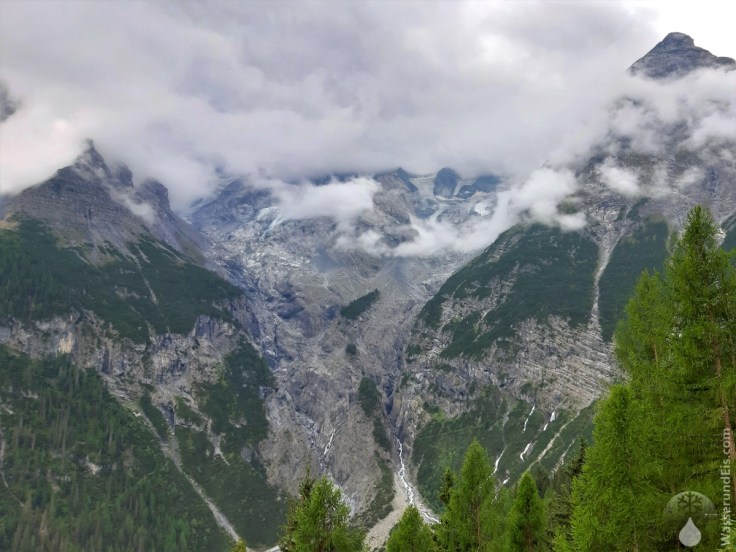 Auf dem Hinweg, am Morgen, hängen die Wolken tief. Die Gegend fasziniert bei jedem Wetter. Zwar bleiben so einige Gifel und Gletcher unsichtbar., die Aussicht ist beschränlt. Das diffuse Licht und die wabbernden Wolkenfetzen strahlen eine Mystik aus, die das vergessen macht. So bleibt der Blick auf das Wesentliche. Die Fahrt durch viele verschiedende Höhenstuden. Von den nahezug mediteranen Tälern des Vinschgaus, durch die Laubwälder bei Prad, schließlich duch den montanen Bergwald und die alpinen Matten bis in die alpine Höhenstufe. Einfach atemberaubend.