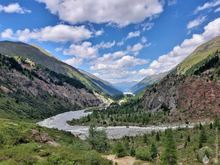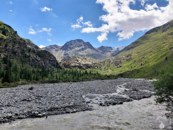 Ausgangspunkt der hin- und zurück Wanderung durch das Vorfeld des Gepatschferners ist der Parkplatz am Fernergarten. Hier beginnt der Wanderweg, direkt an den Ufern des Faggenbachs auf etwa 1.910m Seehöhe. Gleichzeitig lag vor gut 150 Jahren an dieser Stelle das Gletschertor des Gepatschferners. Mittlerweile hat sich die Gletscherzunge mehr als 3,5km zurückgezogen und ist von hier aus schon lange nicht mehr zu sehen. Wir laufen zunächst den Bach entlang, der aufgrund der hohen Temperaturen und der starken Gletscherschmelze beinahe Hochwasser führt. Anschließend geht es durch lichten Wald und dichtes Gestrüpp weiter in den Talschluss hinein. . Hier im vergleichsweise warmen und inneralpinen Trockental liegt die Waldgrenze sonnseitig erst auf 2.100m Höhe, die Baumgrenze noch einmal 100m höher.