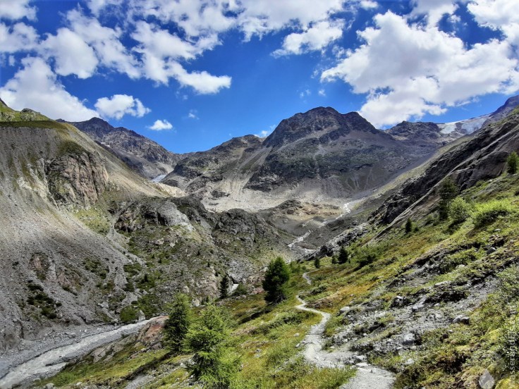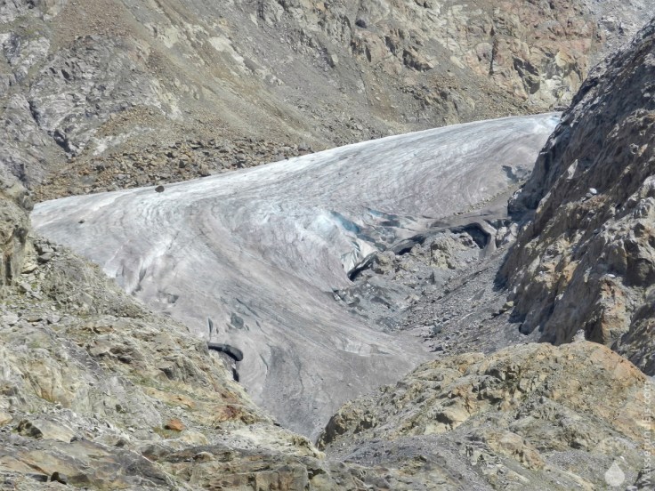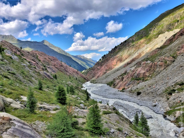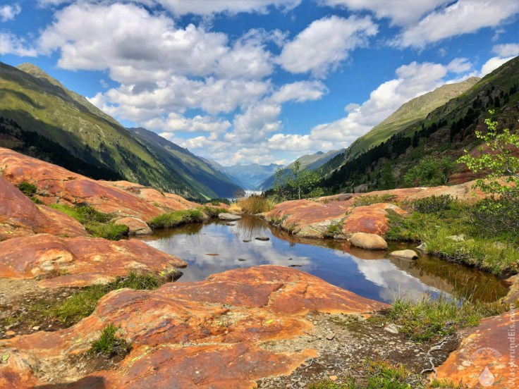 Die Steigung ist zunächst nur moderat, zieht dann aber, beim Aufstieg auf einem großen Rundhöcker leicht bis über 2.100m an. Die Umgebung des Gletschervorfeldes ist karg, felsig und steinig. Das Gelände ist noch nicht lange eisfrei. Die Verwitterung ist noch nicht so weit fortgeschritten, dass größere Pflanzen auf dem nackten Boden halt finden könnten. Dennoch ist die Umgebung farbenfroh, die Kulisse traumhaft. Die Felsen sind vielfarbig und vom Eis glattgeschliffen. Überfall gibt es kleine Tümpel voller Kaulquappen und hier und da sprießt eine kleine Lärche. Tief unter uns fließt der tosende, von grauer Gletschermilch trübe Gepatschbach.