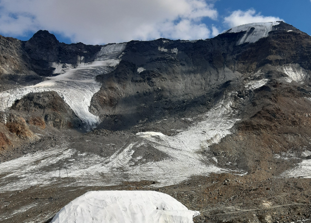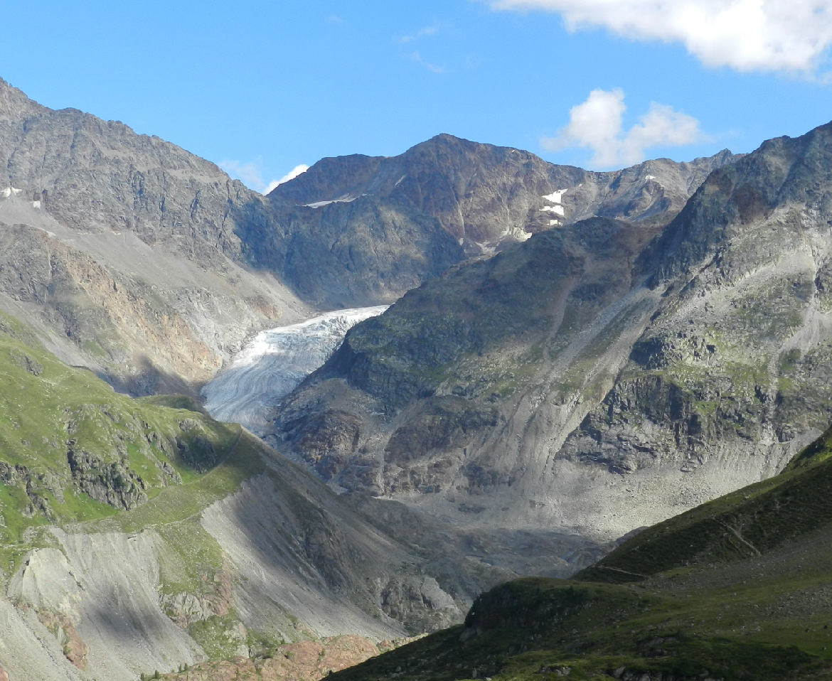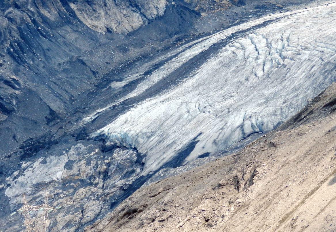Der Madatschferner ist ein großer Gletscher in den Ortler Alpen, gut einsehbar von der Passstraße zum Stilfser Joch. Sein Zungenende liegt oberhalb einer Steilstufe des Trafoier Tals. Auf den Bildern (links 2012, rechts 2022) ist das Einsinken der Gletscheroberfläche und der Rückzug des Eises deutlich zu erkennen. Weiterhin zeigt die extrem verringerte Anzahl der Gletscherspalten, dass das Eis kaum mehr Dynamik aufweist und mangels Nachschub kaum mehr in Bewegung ist bzw. fließt.