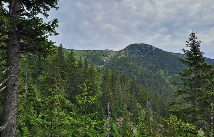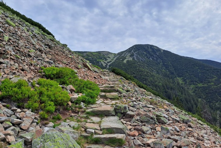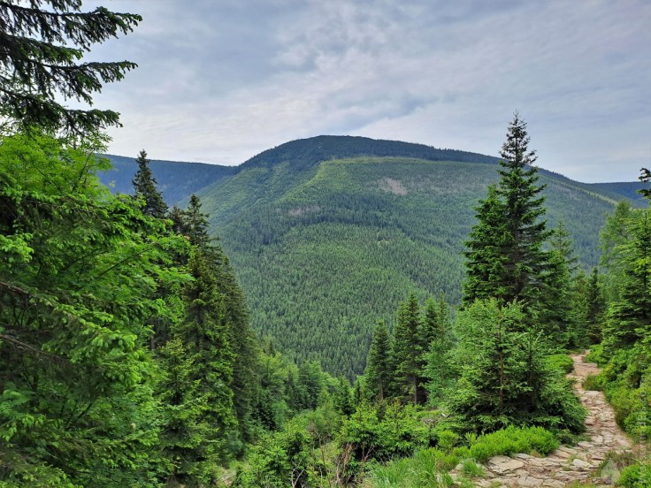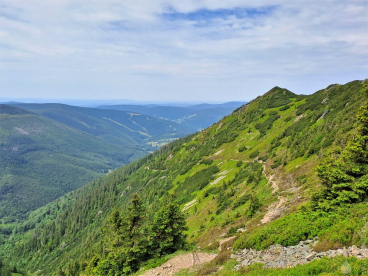 Zunächst spendet uns der Wald noch Schatten. Schließlich erreichen wir auf 1.200m Seehöhe die Waldgrenze, die subalpine Höhenstufe. Hier macht das Wandern besonders viel Spaß, ist die Natur besonders Wild und rau. In dieser Kampfzone weicht der Wald Geröllfeldern, einzelnen Bäumen und niedrigen Latschenkiefern. Das macht den Weg entgültig frei für das Panorama auf das Grundwassertal mit St. Peter, die Gipfel den südlichen Riesengebirges und lässt die Anstrengugen leicht vergessen.