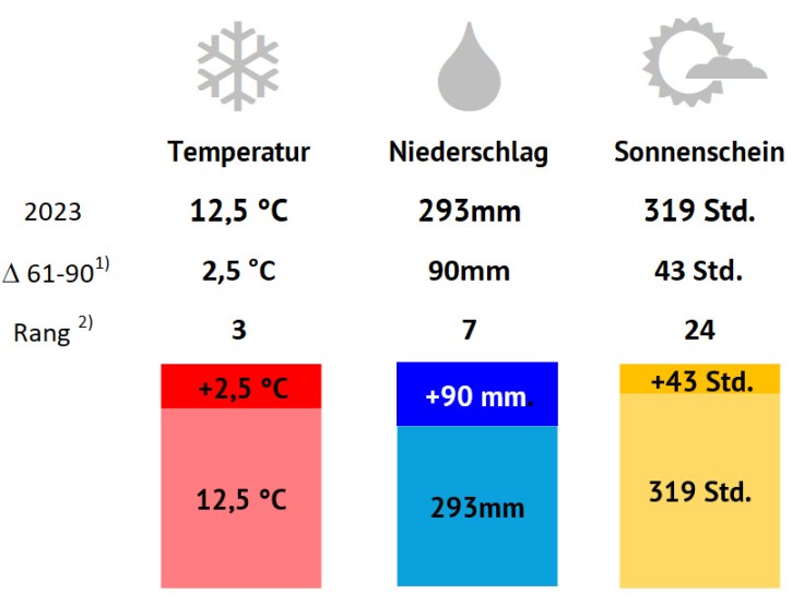 Der goldene Oktober fiel 2023 sprichwörtlich ins Wasser, er war der nasseste seit Messbegin2). Insgesamt fielen 167mm Regen auf den Quadratmeter, 103mm mehr als üblich1). Dem Niederschlag entsprechend war es meist trüb, die Sonnenscheindauer erreichte nur 75% der monatsüblichen Dauer1). Über den Gesamtverlauf gesehen war der Oktober 2023 zu warm. Die Temperaturabweichung betrug +2,0°C1).
