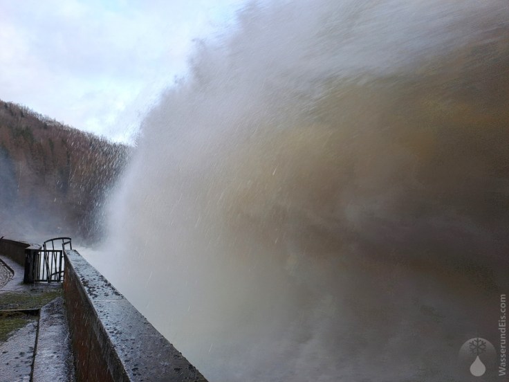 Der Grundablass ist ein seltenes Ereignis. Grund genug für uns, das ganze Mal aus der Nähe zu betrachten. Von der Krone der fast 70m hohen Staumauer, aber auch am Fuß des Absperrbauwerkes. Dort wo 30.000 Liter pro Sekunde mit unglaublicher Wucht aus der Staumauer schießen.