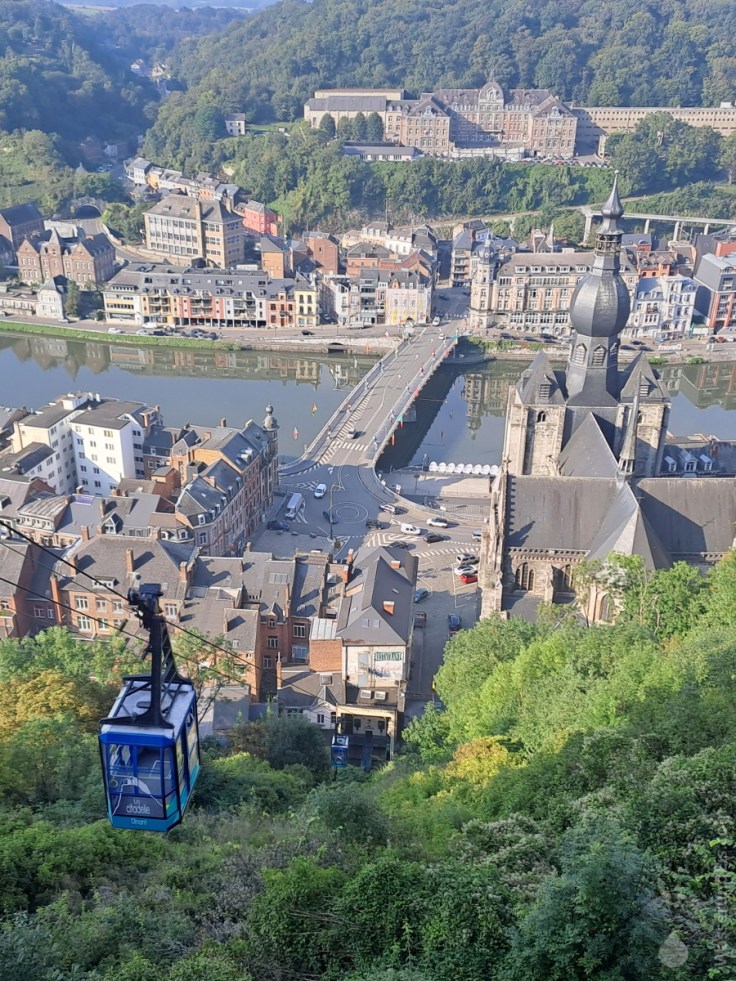 Während die Höhenzüge der Ardennen im Westen den Horizont bilden, reicht der Blick im Süden über das glitzernde Wasser bis zur Maasschleife von Anseremme und dem „Viaduct Charlemagne“. Im Norden bis zum Château de Crèvecœur bei Bouvignes sur Meuse. Direkt vor uns spiegeln sich die Häuser von Dinant in der Maas – Toll!