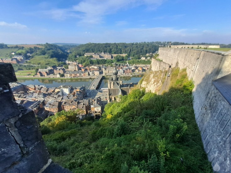 Von der Zitadelle und den angrenzenden Felsen bietet sich ein imposanter Ausblick – kein Wunder, befinden wir und hoch über dem Tal der Maas. Dinant liegt uns nicht nur sprichwörtlich zu Füßen. Die Gärten und Terrassen der Stadt liegen nur einen Steinwurf entfernt – und das ist nicht nur so daher gesagt. Da die Felswand unter der Zitadelle quasi senkrecht ist, ist dem auch wirklich so. Bleibt zu hoffen, dass nicht auch wirklich ab und an mal ein Stein fliegt…