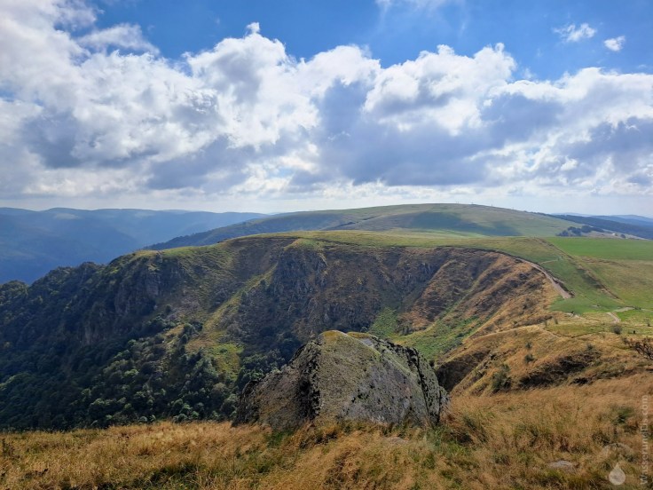 Aber der Reihe nach. Wir stellen das Auto am Fuß des Hohnecks ab – wobei Fuß stark übertrieben ist. Die Kammstraße verläuft stets in Gipfelnähe, aber immerhin nennt sich die benachbarte Hütte „Auberge le Pied du Hohneck“ – also ist das nicht so falsch. Von hier sind es noch knappe 100 Höhenmeter zum Gipfel des Hohneck, die wir zu Fuß zurücklegen. Das Wetter ist für Mitte September kühl und windig. Sonne und Wolken wechseln sich ab – und das mit der Fernsicht können wir vergessen, macht aber nichts.