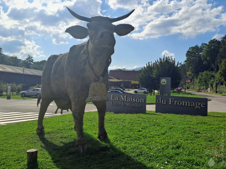 Nach dem kurzen Spaziergang fahren über die Passstraße des Col de la Schlucht ins Tal hinab. Bis in den Hauptort des Tals, Munster, sind es fast 1.000 Höhenmeter. Die Landschaft wandelt sich von Bergweiden zu Weinreben, was ein Kontrast – auch temperaturtechnisch. Im Ort werden wir auf das Schild „Maison de Fromage“ zu deutscht „Haus des Käses“ aufmerksam. Wir mögen Munsterkäse, deshalb folgen wir dem Schild.