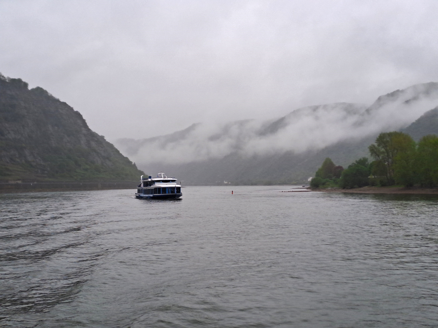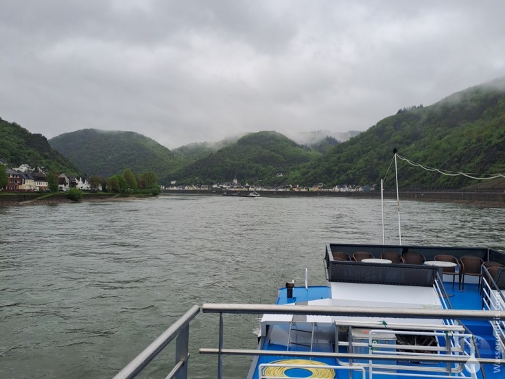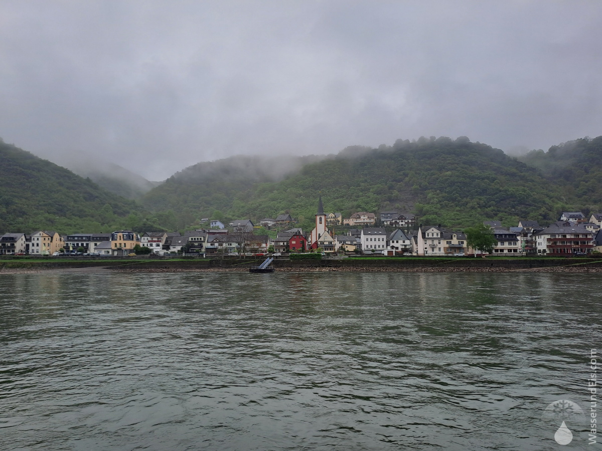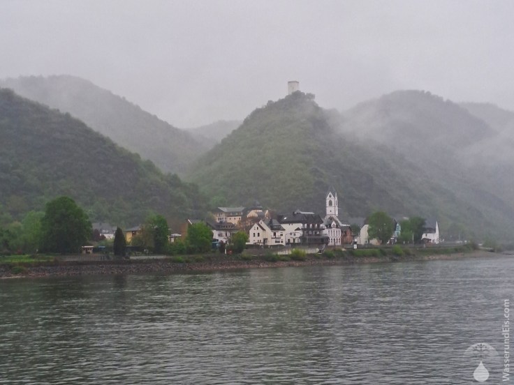 Pünktlich legt unser Schiff in Boppard ab. Es ist Nebensaison und trotz des wenig wanderfreudigen Wetters sind wir die einzige Fahrgäste. Das Wetter ist trüb und regnerisch, Nebenschwaden wabbern um und über die grünen Hügel – gerade das ist sehr stimmungsvoll. Abgesehen von den gelegentlichen Lautsprecherdurchsagen und dem plätschernden Wasser ist es still. Eine Fahrt zu genießen. Zunächst fahren wir die Strecke ab, die wir vor zwei Tagen gewandert sind, von Boppard über Filsen nach Kestert. Ein interessanter Perspektivwechsel.