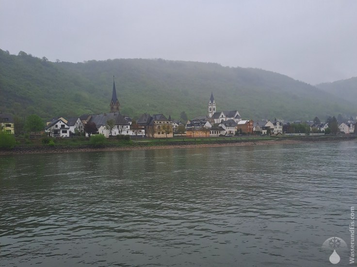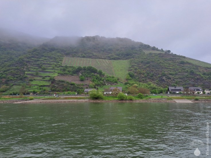 Beidseitig des Rheins ragen die grünen Hügel steil in die Wolkendecke hinein. Der breite Strom wirkt hier wie ein Fjord mit kleinen Dörfern am Ufer. Die Landschaft versetzt und nach Skandinavien – nur die Weinberge, an denen wir hin und wieder vorbei Fahren wirken etwas unpassend für den Norden in dem wir uns gar nicht befinden.