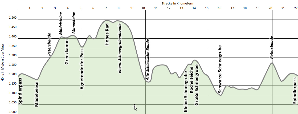 Rundwanderung über und unterhalb des westlichen Hauptkamm des Riesengebirges vom Spindlerpass zur Schneegrubenbaude und zurück. Ausgangspunkt des Rundwanderweges ist die Spindlerbaude (tsch. Špindlerova bouda) in 1.208m Seehöhe. Von hier aus führ der weg zunächst über den Kammweg der polnisch-tschechischen Freundschaft zur Schneegrubenbaude mit der Rübezahlkanzel (1.497m) als Kulminationspunkt der Wanderung.